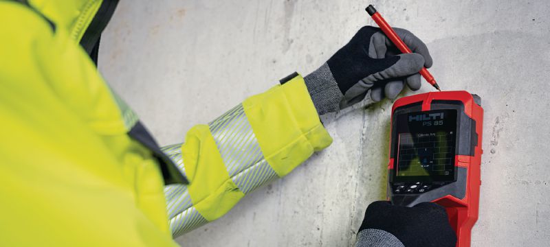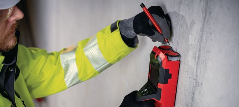 - Locating embedded objects for hit prevention when drilling, coring, cutting or slitting (up to 85 mm depth, depending on material) on the wall